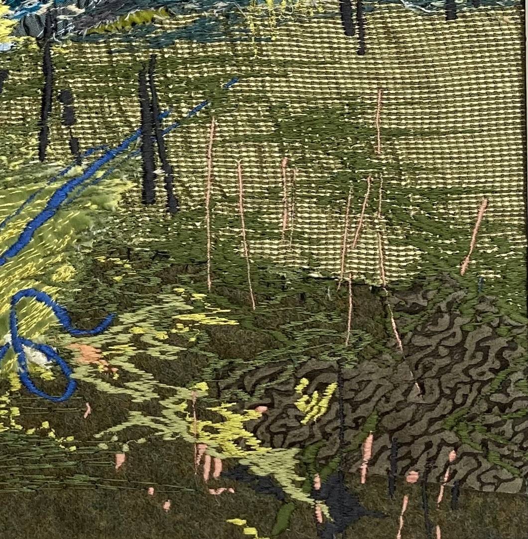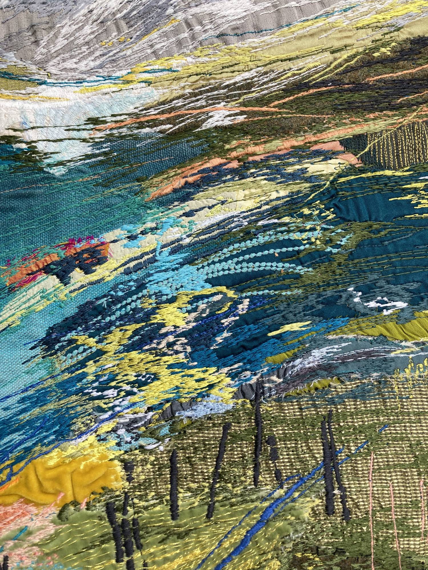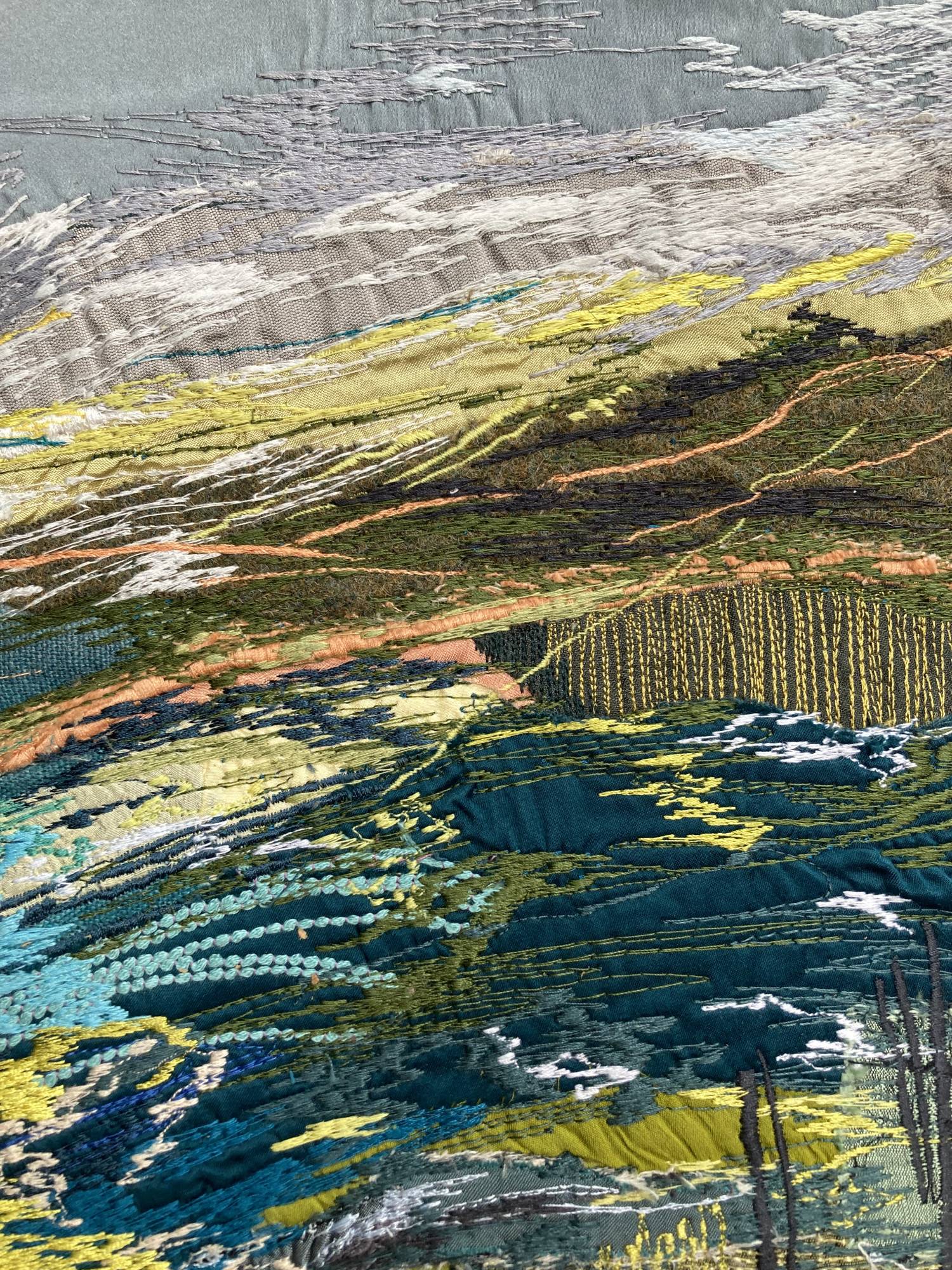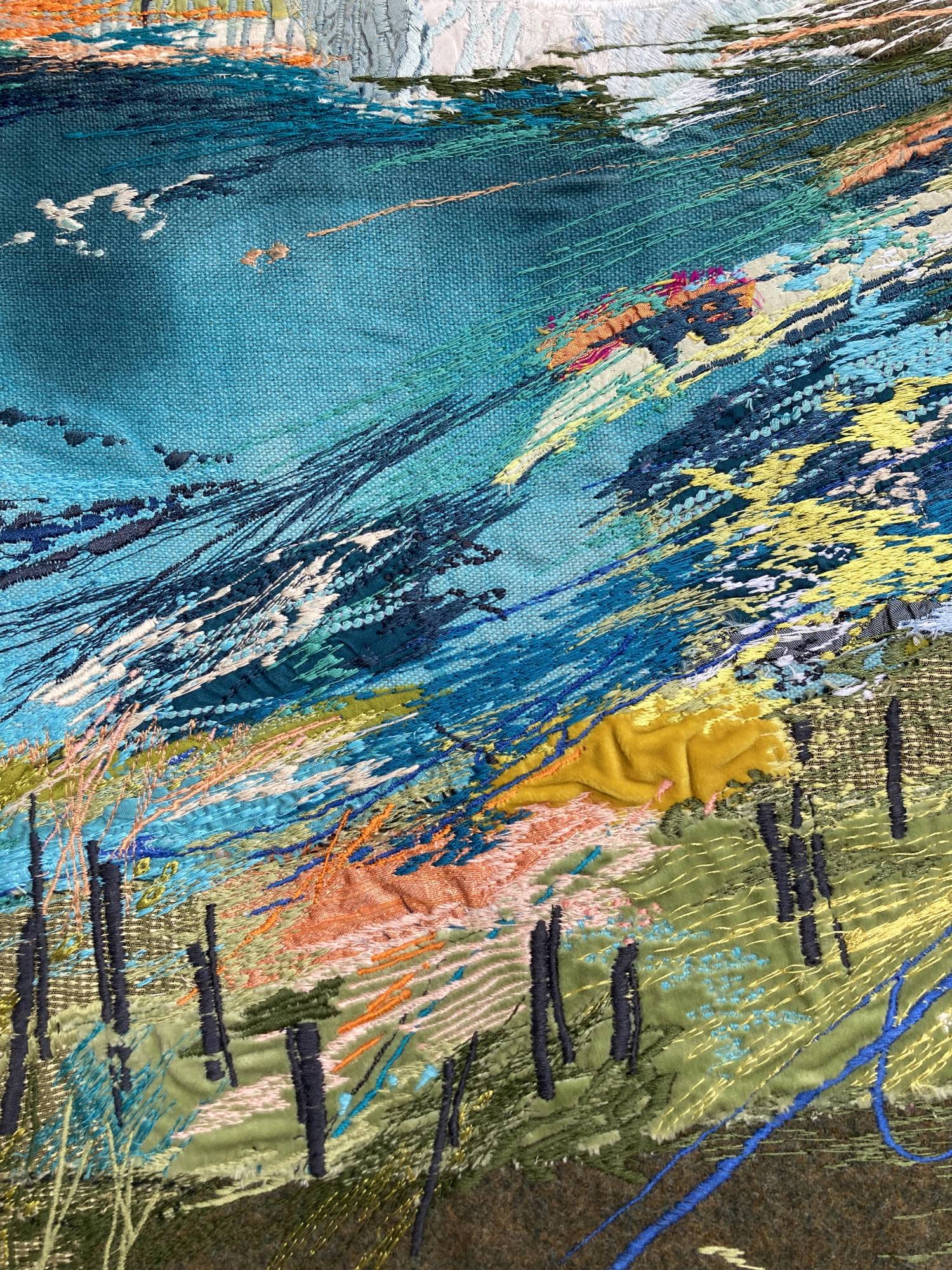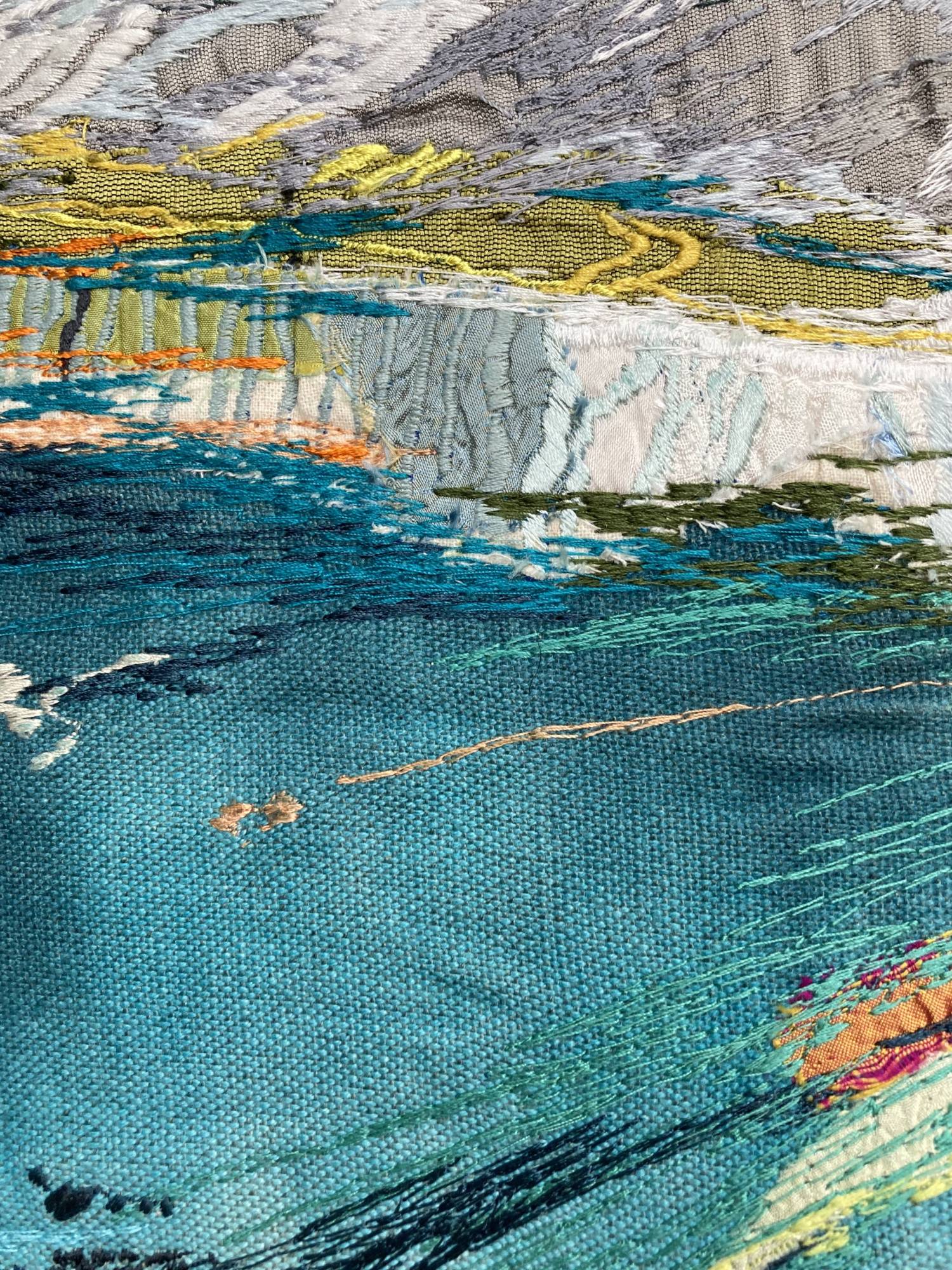 Free machine embroidery developed after a long walk from Port Quinn to Port Issac . Sun on your face and wind in your hair. Hand painted linens, wool fabric, leather with free motion stitching to bring it alive.